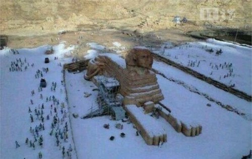 It is the first snow of 112 years in Cairo, Egypt and the Sphinx is covered with snow